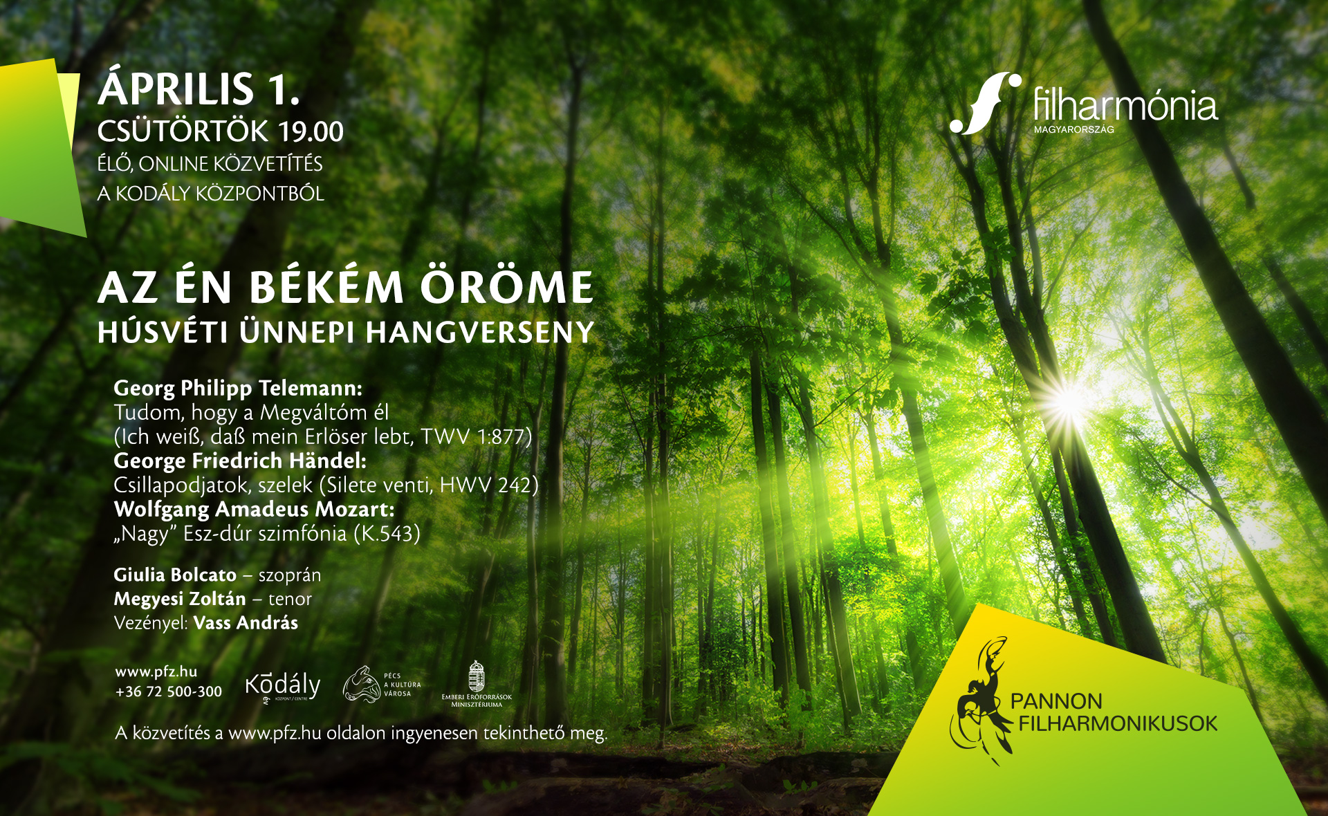 Hagyományosan kórusos koncerttel kedveskedik a Pannon Filharmonikusok a húsvéti várakozás időszakában. A mostani járványhelyzet a karácsonyihoz hasonlóan azonban most is különös műsorra ad lehetőséget: ez a hangverseny ugyanis kórus nélkül, ugyanakkor két ragyogó énekes szólistával kerül megrendezésre, sőt, egy szimfónia is helyet kapott a műsorban. A közvetítés a www.pfz.hu oldalon ingyenesen tekinthető meg.